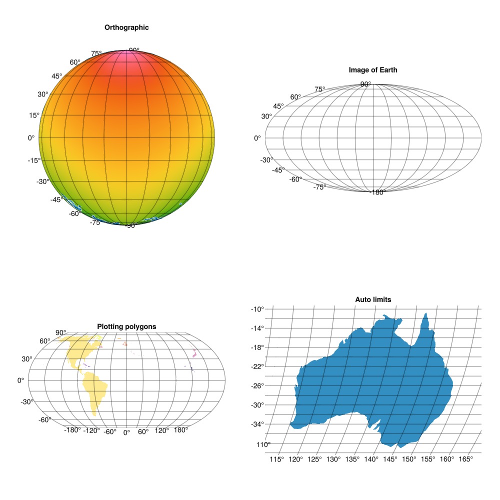GeoMakie.jl is a Julia package for plotting geospatial data on a given map projection. It is built on top of the Makie.jl plotting ecosystem.