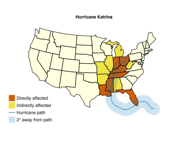 ["Directly affected", "Indirectly affected", "Hurricane path", "2° away from path"],