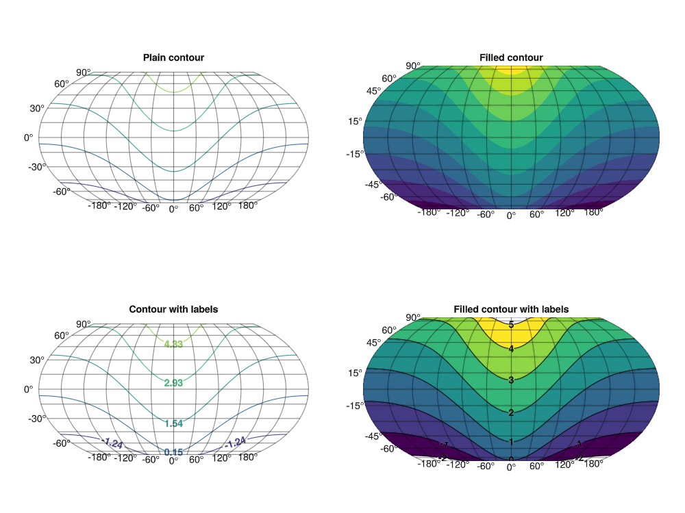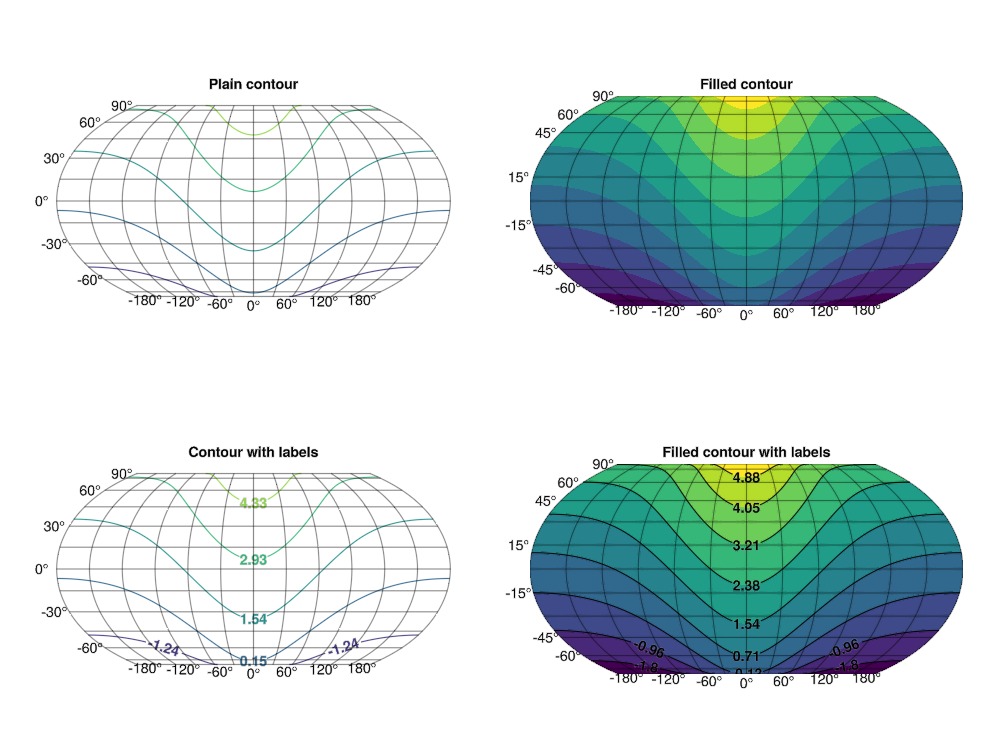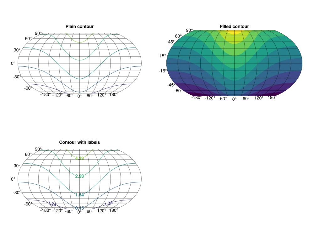 ax4 = GeoAxis(fig[2,2]; title = "Filled contour with labels")
