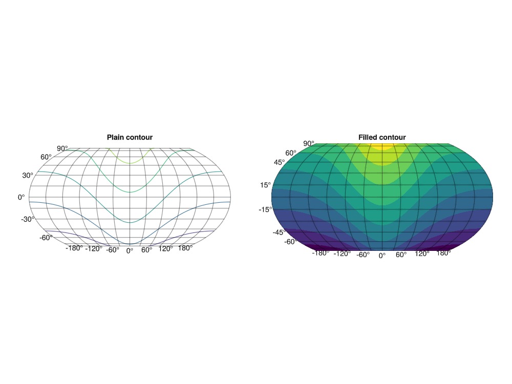 ax2 = GeoAxis(fig[1,2]; title = "Filled contour")
