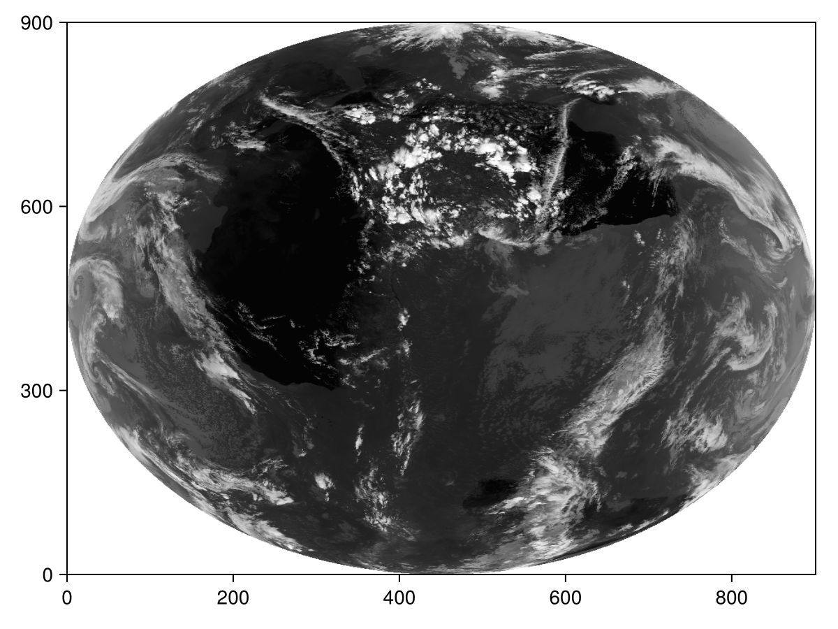 First, we load our packages and download the image we want to display, in this case a black-and-white image of the Earth from a satellite in geostationary orbit.