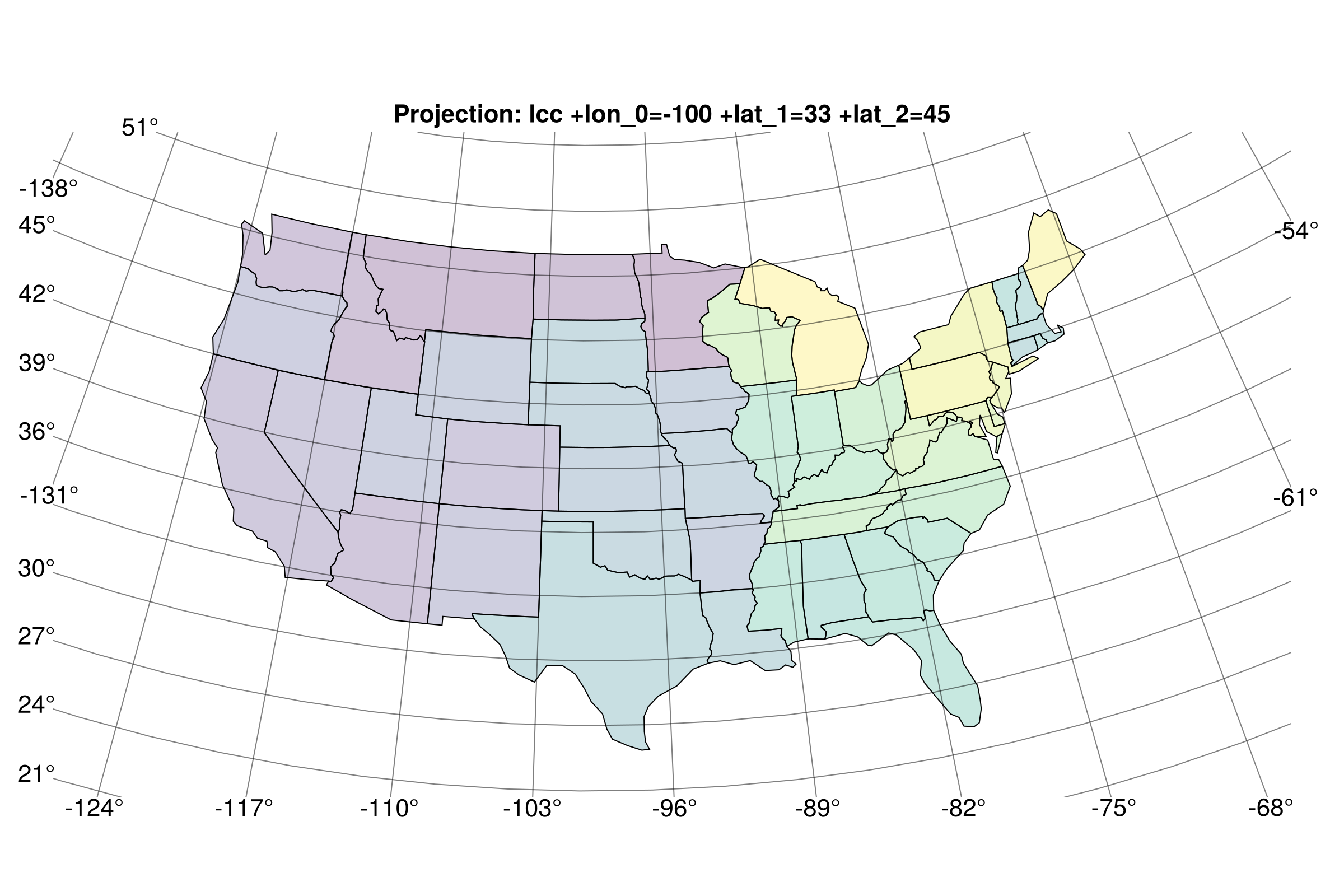 title = "Projection: lcc +lon_0=-100 +lat_1=33 +lat_2=45",