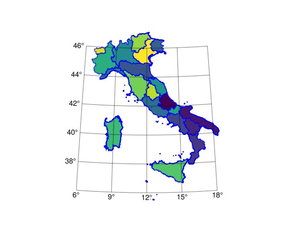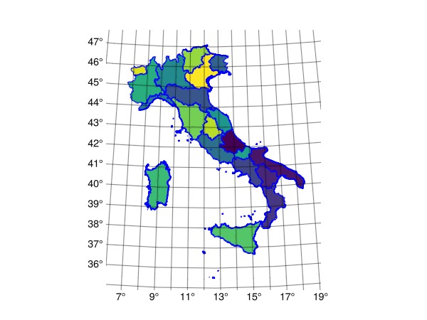 Choosing a projection for the map is important, of course, and for a country like Italy, we can get away with an orthographic projection, which is kind of like an overhead view from a great distance.