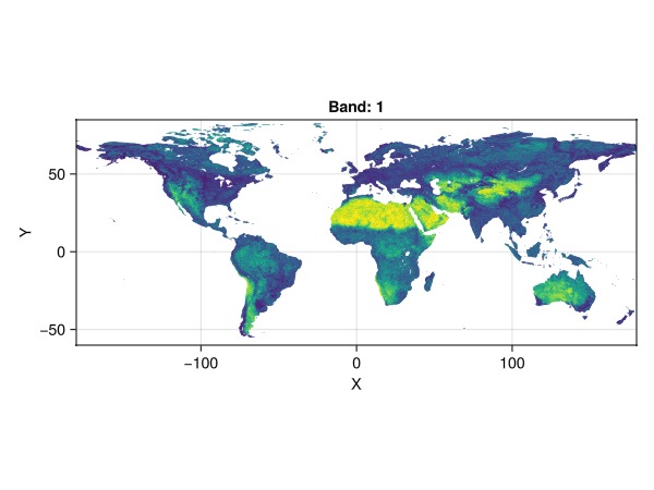 using Rasters, RasterDataSources, ArchGDALWe'll also load GeoMakie and CairoMakie to plot the data.